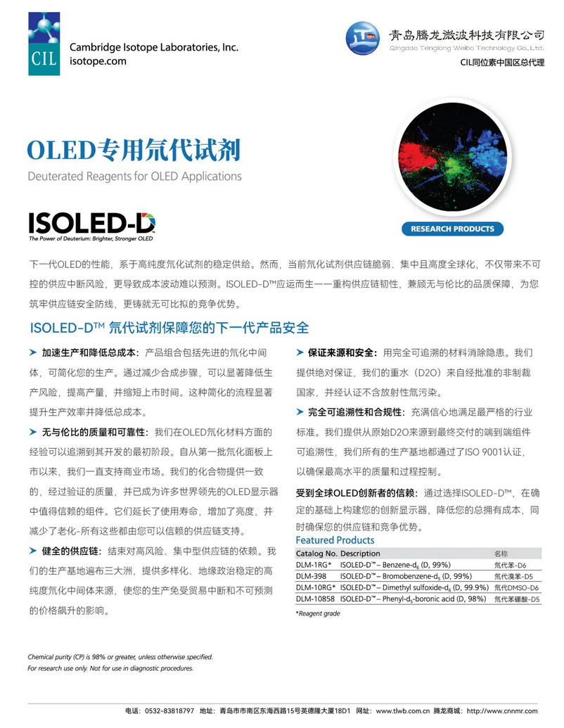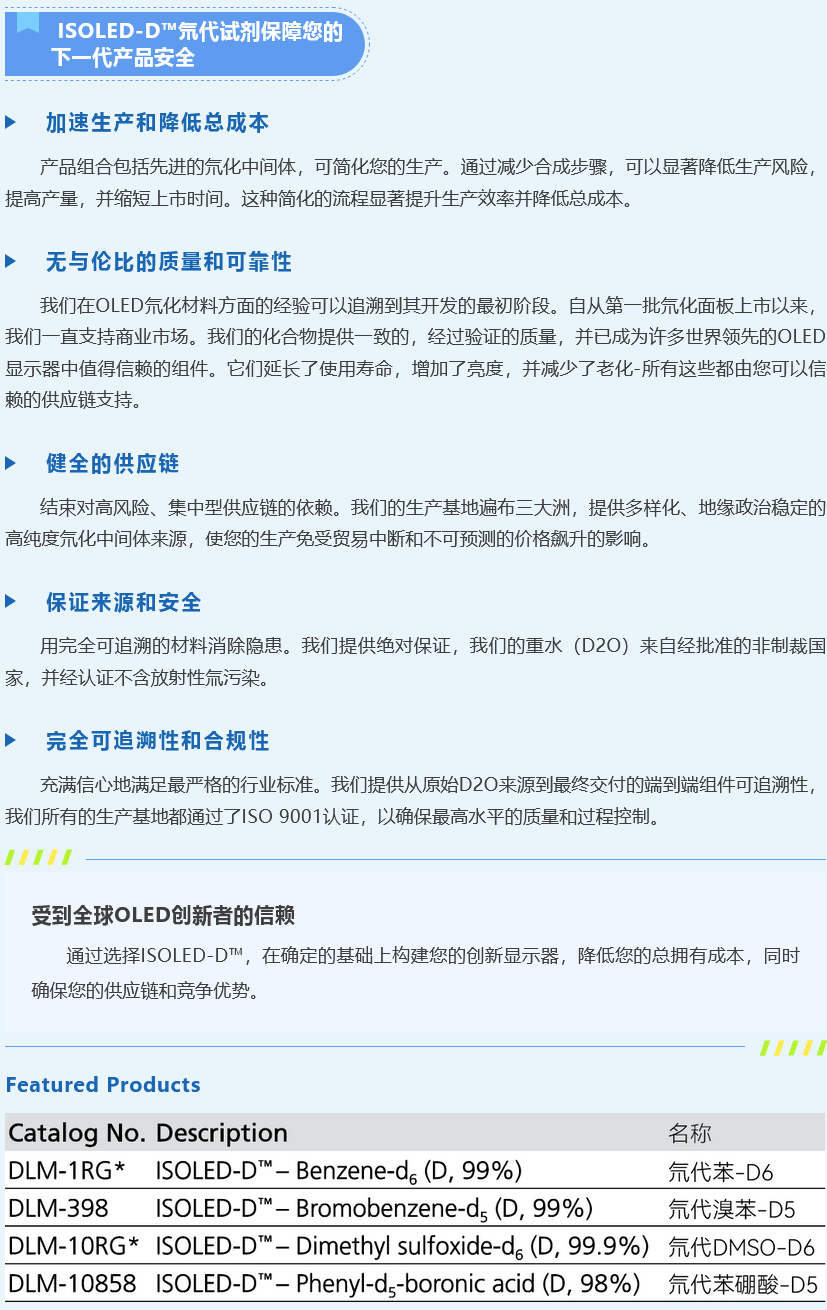 下一代OLED的性能,系于高純度氘化試劑的穩(wěn)定供給。然而,當前氘化試劑供應(yīng)鏈脆弱、集中且高度全球化,不僅帶來不可控的供應(yīng)中斷風險,更導致成本波動難以預(yù)測。ISOLED-D?應(yīng)運而生——重構(gòu)供應(yīng)鏈韌性,兼顧無與倫比的品質(zhì)保障,為您筑牢供應(yīng)鏈安全防線,更鑄就無可比擬的競爭優(yōu)勢。