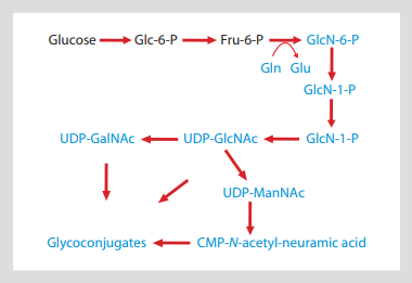 Fig. 1: hexosamine biosynthesis pathway shows that the side chain of glutamine is the ammonia in the process of glyconucleotide production