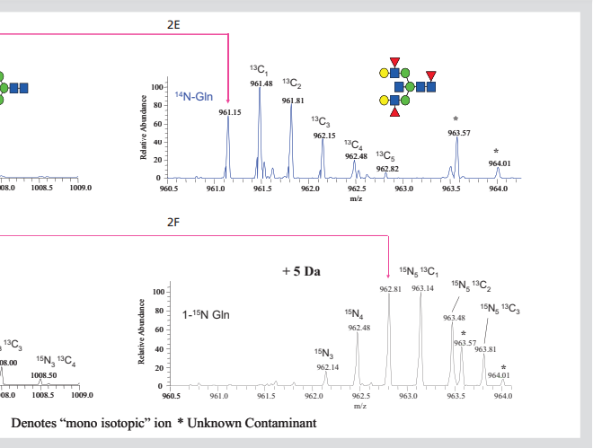 A large number of N-linked glycans were similarly increased in mass by inserting a 15N into each GlcNAc terminal group. This can be observed by extending the spectra shown in FIGS. 2a and 2b so that only regions from 960.5 to 964.1 can be observed (FIGS. 2e and 2F, for glycans released by cells grown in 14N and amide 15N Gln media, respectively). This region shows molecular ion, (M + 3Na) 3 +, which is used to form complex glycans of glcnac5man3gal2fuc3. As predicted, when the glycan was obtained from cells grown in 15N Gln, its single isotope ion increased by + 5da. In addition, the fully labeled glycan is the main form of existence, but the ions can be observed from the incomplete labeled glycan.