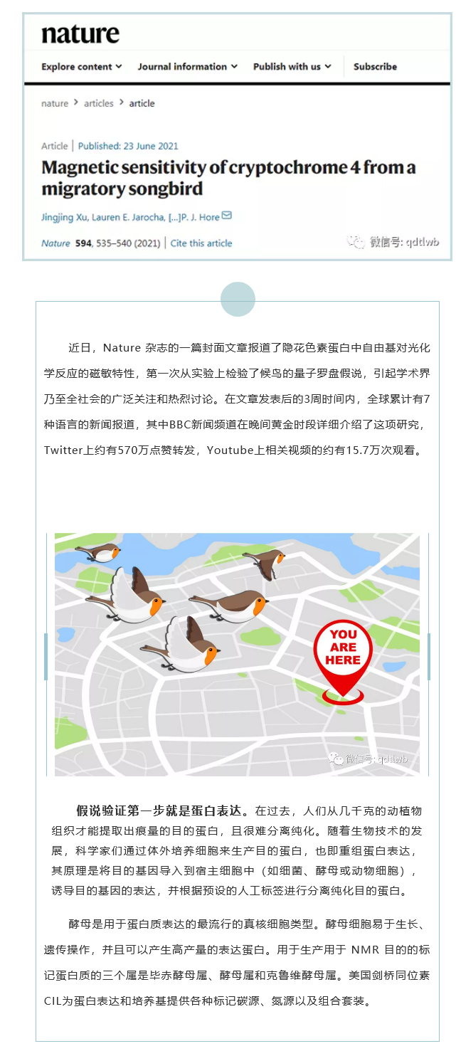近日,Nature 雜志的一篇封面文章報(bào)道了隱花色素蛋白中自由基對(duì)光化學(xué)反應(yīng)的磁敏特性,第一次從實(shí)驗(yàn)上檢驗(yàn)了候鳥的量子羅盤假說,引起學(xué)術(shù)界乃至全社會(huì)的廣泛關(guān)注和熱烈討論。在文章發(fā)表后的3周時(shí)間內(nèi),全球累計(jì)有7種語言的新聞報(bào)道,其中BBC新聞?lì)l道在晚間黃金時(shí)段詳細(xì)介紹了這項(xiàng)研究,Twitter上約有570萬點(diǎn)贊轉(zhuǎn)發(fā),Youtube上相關(guān)視頻的約有15.7萬次觀看