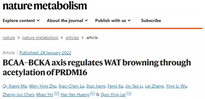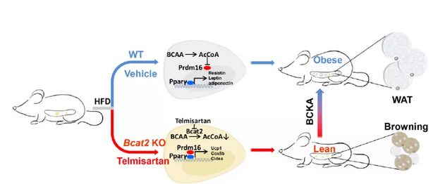 2022年1月24日,復(fù)旦大學(xué)雷群英、黃海艷和尹淼聯(lián)合在Nature Metabolism雜志發(fā)表了題為BCAA–BCKA axis regulates WAT browning through acetylation of PRDM16 研究文章,作者發(fā)現(xiàn)BCAT2(白色脂肪中代謝BCAA的關(guān)鍵酶)全脂肪特異敲除小鼠以及白色脂肪特異敲除小鼠能抵抗高脂誘導(dǎo)的肥胖,深入研究發(fā)現(xiàn)脂肪組織中敲除BCAT2減少了BCAA來源的Ac-CoA,造成Prdm16乙酰化水平下降,從而增強轉(zhuǎn)錄因子Prdm16和Pparγ相互作用,促進了白色脂肪棕色化。進一步藥物篩選發(fā)現(xiàn)替米沙坦直接結(jié)合BCAT2來抑制BCAA代謝,從而抵抗高脂誘導(dǎo)的小鼠肥胖,為臨床藥物治療肥胖提供了思路。