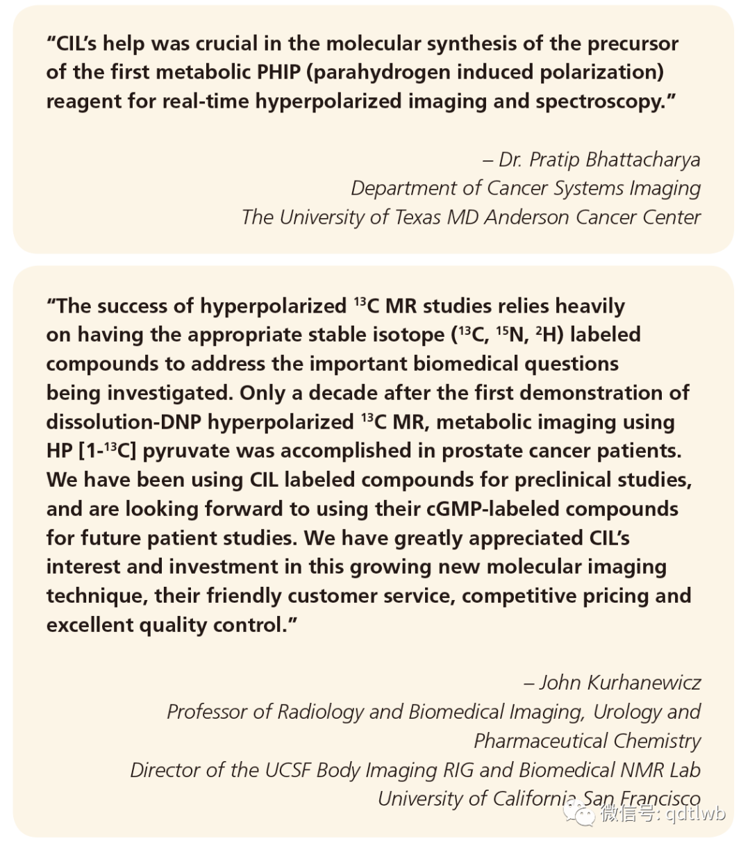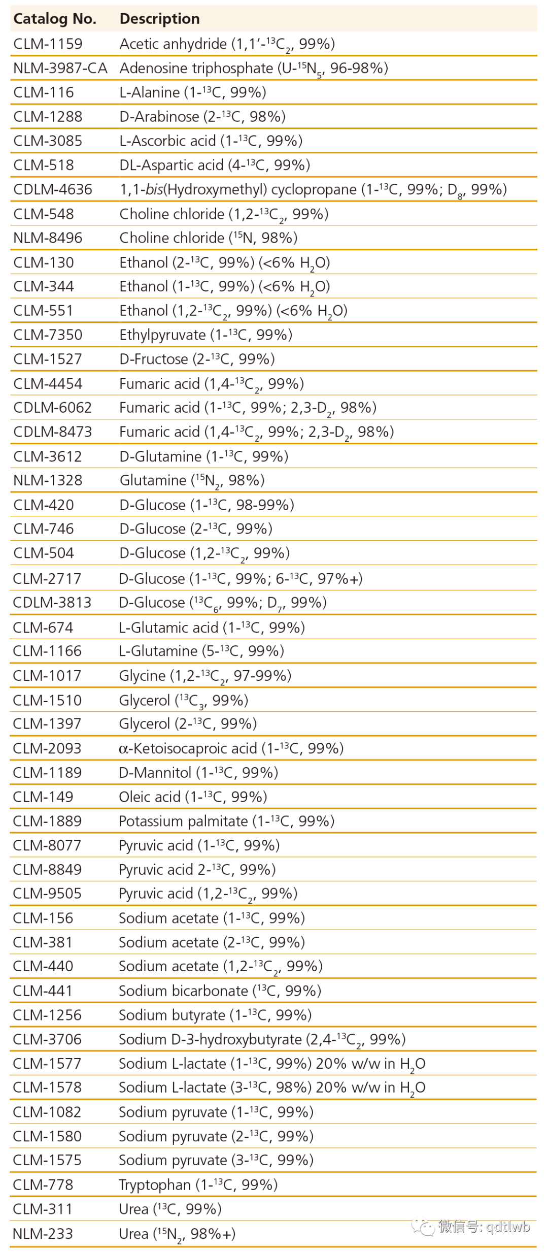 CIL提供以下超極化富集底物,用于代謝研究以及PHIP和DNP實驗。由于消除了13C-1H偶極弛豫,鄰近13C核的氘的存在可能有助于延長T1時間。研究顯示,其中一個或多個化合物超極化在同一個樣本,從而同時探測多種途徑。
