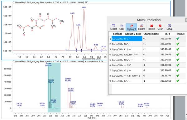 該功能允許用戶提出一個或多個分子式,并使用所有預(yù)定義的加合物/損失列表預(yù)測其質(zhì)量峰;Mnova MS預(yù)測列表中的分子離子峰和同位素峰,并自動將預(yù)測峰與實驗峰(如果可用)進行匹配;用戶可以選擇在光譜上顯示哪種預(yù)測(具有所需加合物或損失)以進行比較。