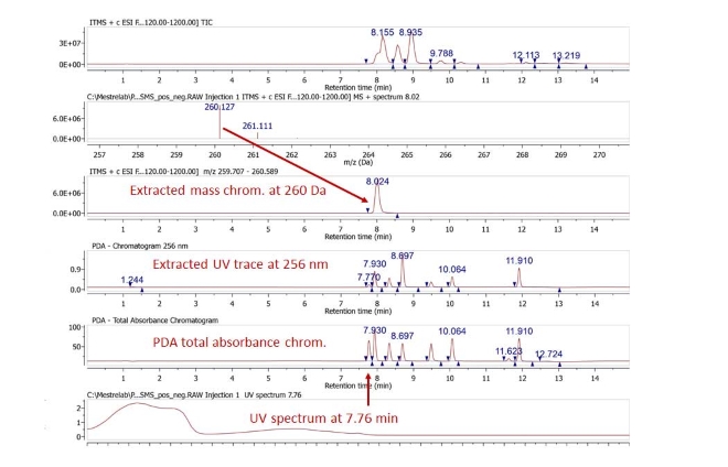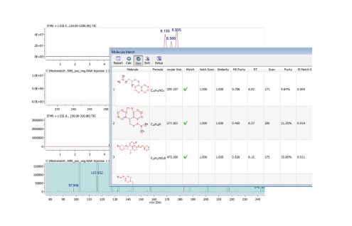 除NMR插件中利用核磁共振數(shù)據(jù)進行結(jié)構(gòu)確認(rèn)的許多工具以外,在Mnova MS中的分子匹配功能可以通過LC/GC/MS數(shù)據(jù)進行結(jié)構(gòu)確認(rèn);