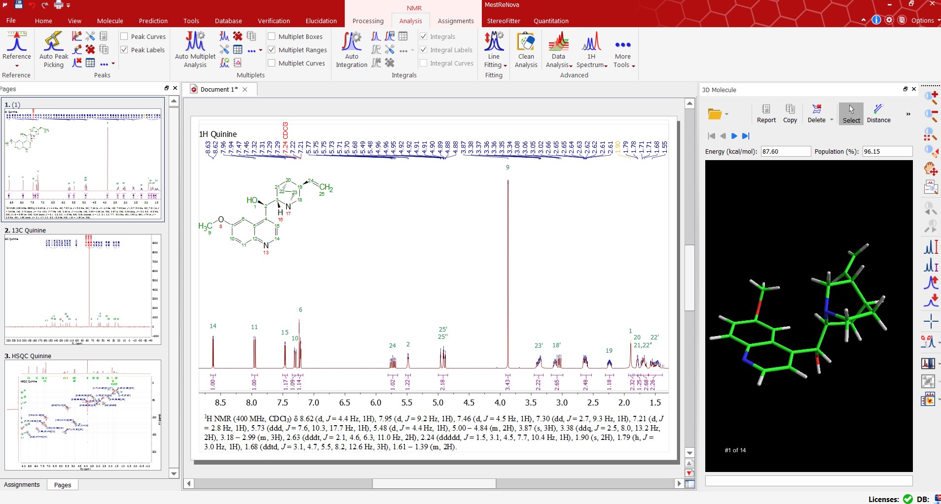自動譜圖分析從未如此強(qiáng)大。我們的自動分析執(zhí)行全譜去卷積 (GSD)(包括分辨率增強(qiáng)步驟)以分離所有可用信號。然后,軟件對特定類別(化合物、雜質(zhì)、13C衛(wèi)星、溶劑等)內(nèi)的每個單獨峰進(jìn)行表征和標(biāo)記,并在完成該步驟后,分析化合物信號,將其分組為相關(guān)多重峰,進(jìn)行積分、標(biāo)記等。全自動的過程將使您在分析譜圖時得到理想的結(jié)果,并且,如果您想要優(yōu)化分析,Mnova在每個步驟都具有交互控制。