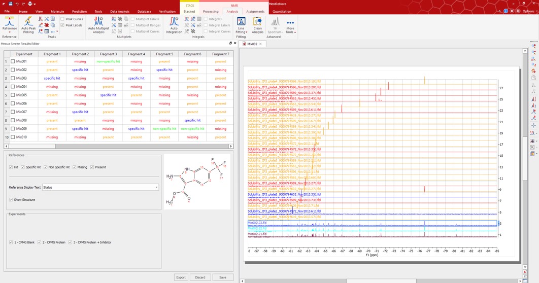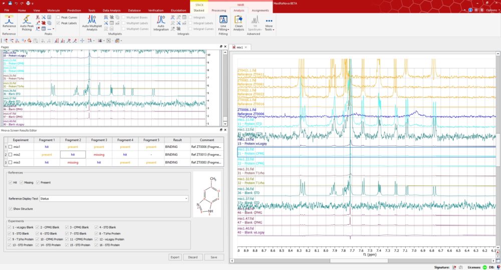 通過NMR進行基于片段的藥物篩選的自動分析工具 Mnova Screen是簡單高效的工具,具有靈活的分析和報告功能,已被頂級制藥公司使用。Mnova Screen可以處理來自以下篩選實驗的所有數(shù)據(jù): 1H或19F 單一化合物或混合物 有無參考譜圖 單一或多種類型的譜圖(STD、T1rho、Watergsy、CPMG) 使用Blank, w/ Protein, & w/ Protein+ Inhibitors 您可以在 Mnova Screen overview閱讀更多信息,還可以查看與Bruker合作舉辦的新網(wǎng)絡(luò)研討會 webinar。 > 獲取license |